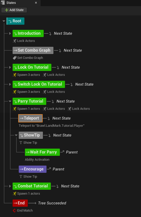 - Fast iteration: You can reorder states, disable them, or split the tree into multiple files so teammates can work on it simultaneously.